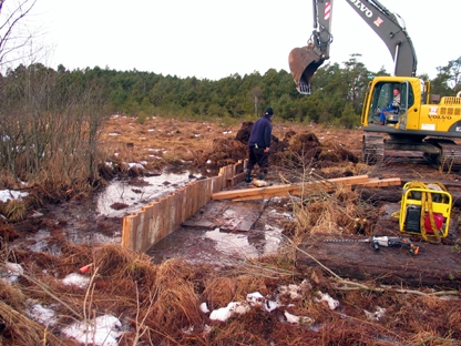 Regeneration des Hochmoors Blitzenreuter Seenplatte. Bau von Spundwänden und setzen des Überlaufs (Fotos von Sabine Harms und pluspunkt). Projektbeschrieb